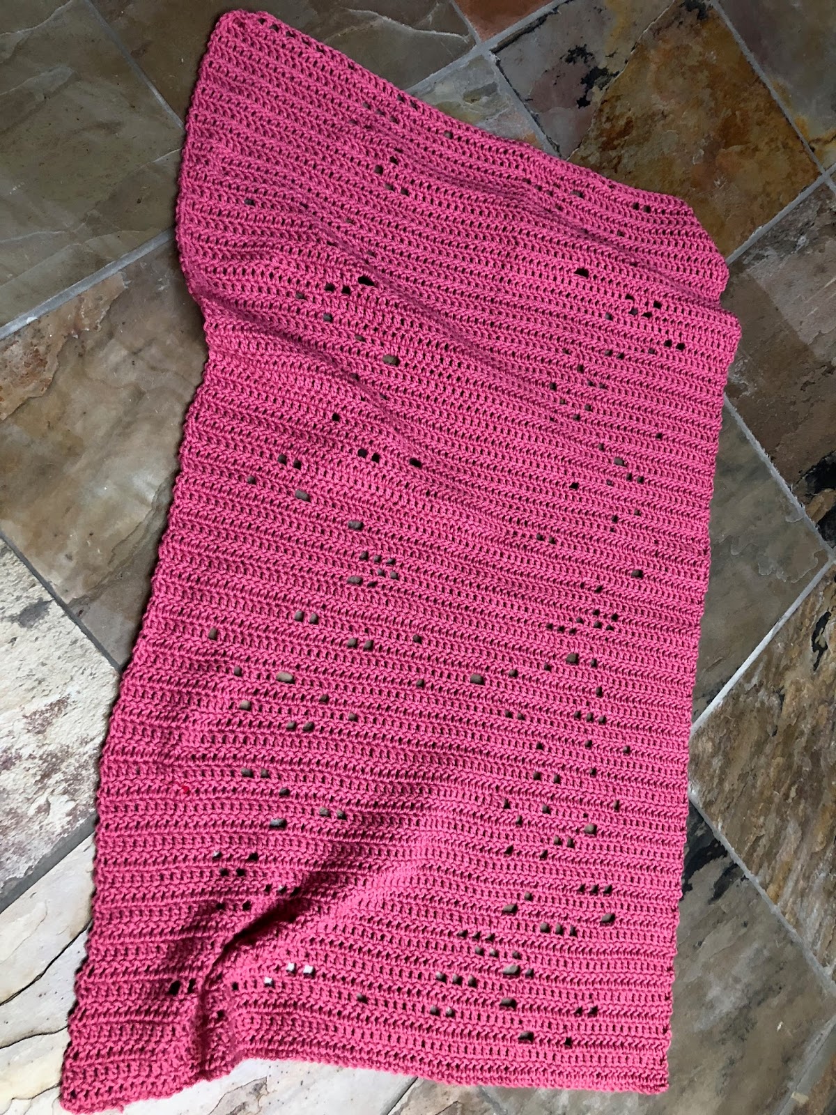This bright pink afghan is made using double crochet. I left blank stitches ("holes") very randomly throughout the afghan.